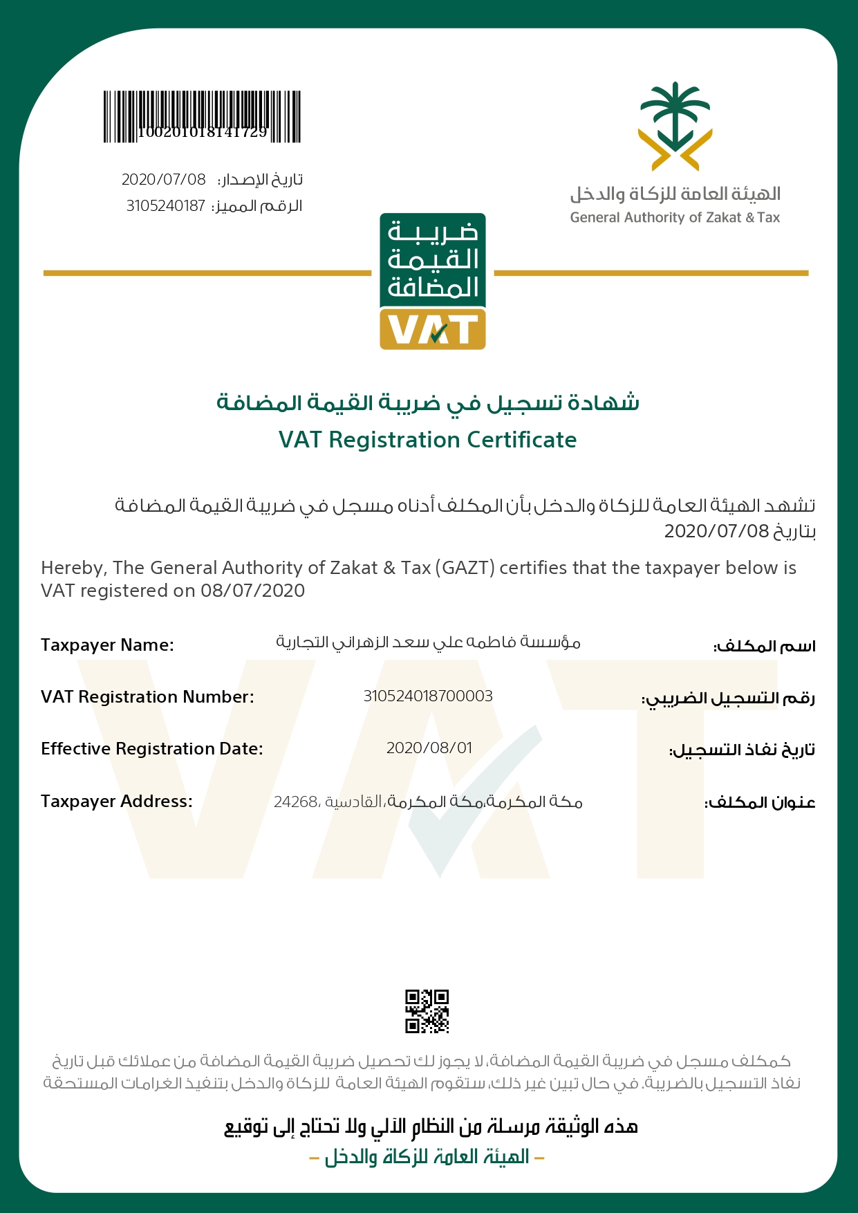 صورة شهادة ضريبة القيمة المضافة